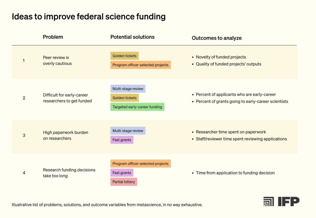 - Organization-based grants. Flexible grants to organizations focused on producing knowledge or solving problems within specific domains. These can include focused research organizations (FROs) — nonprofit research organizations dedicated to solving one significant problem. They are large enough to undertake ambitious projects and operate outside university bureaucracy. Organization-based grants can include institutional models similar to the recently announced NSF Tech Labs, which will “support full-time teams of researchers, scientists, and engineers who will enjoy operational autonomy and milestone-based funding as they pursue technical breakthroughs that have the potential to reshape or create entire technology sectors.” IFP has proposed X-Labs as a structure for funding research nonprofits that focus on strengthening different parts of the science ecosystem.