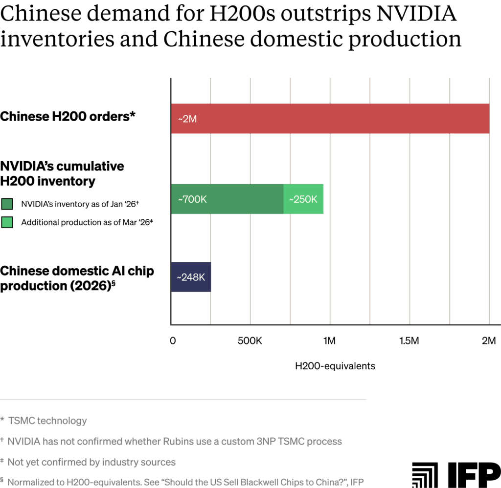 Released in 2024, the H200 and MI325X sit one architectural generation behind each chip designer’s current frontier.10 Chinese entities have reportedly ordered more than two million H200s as of January — the compute equivalent of approximately one OpenAI-sized AI lab.11 This exceeds NVIDIA’s then-reported inventory of 700,000 chips.