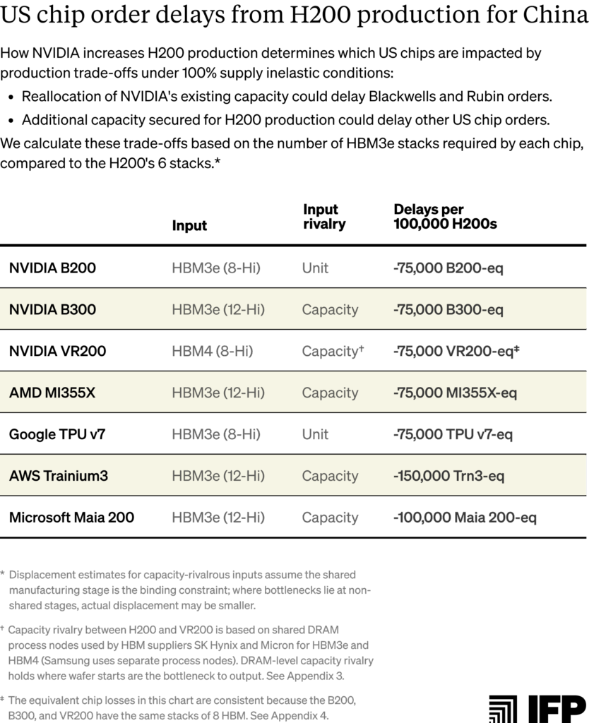 Order delays for US customers due to input or capacity reallocations for H200s are quantifiable based on shared HBM inputs and HBM production capacity. We summarize these delays based on 100% inelastic HBM supply conditions, meaning the figures below represent maximum potential trade-offs.46 Per-chip losses are calculated by dividing the H200’s HBM3e stack count (six) by each rival chip’s stack count.47 A more detailed breakdown of these calculations is provided in Appendix 4.