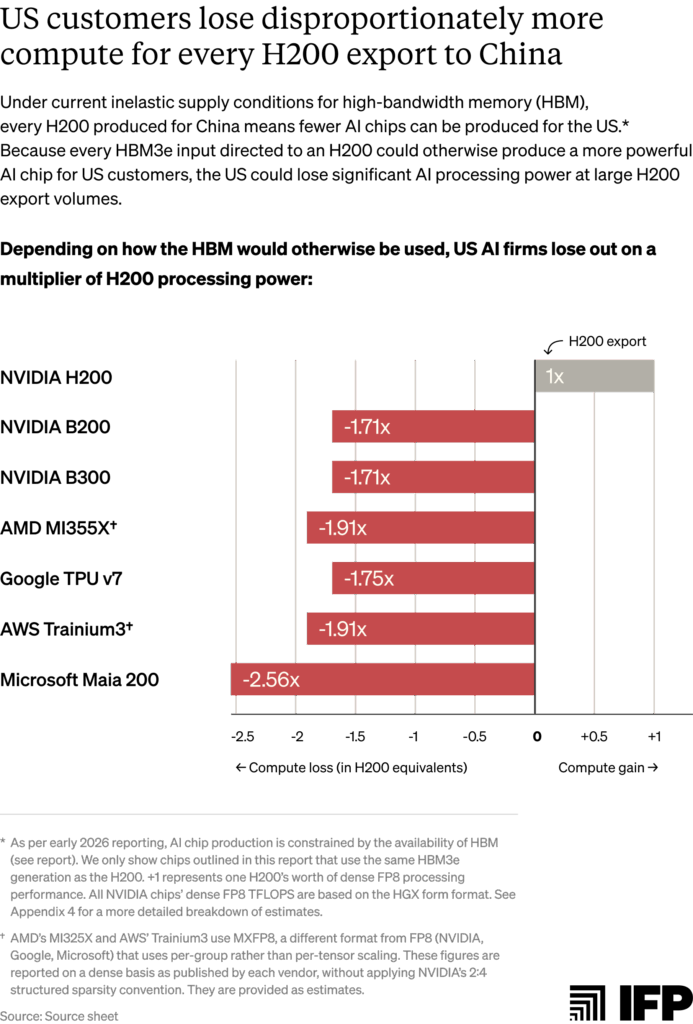 Per-chip trade-offs understate the cost to US customers in terms of forgone computing power. More advanced US chips deliver significantly greater processing performance per unit of shared input, meaning that each H200 export costs the United States more computing power than China gains. As the figure below illustrates, each H200 exported to China costs the US nearly 2x the compute in foregone AMD MI355X and AWS Trainium3 production, and close to 2.6x in foregone Microsoft Maia 200 production.50
