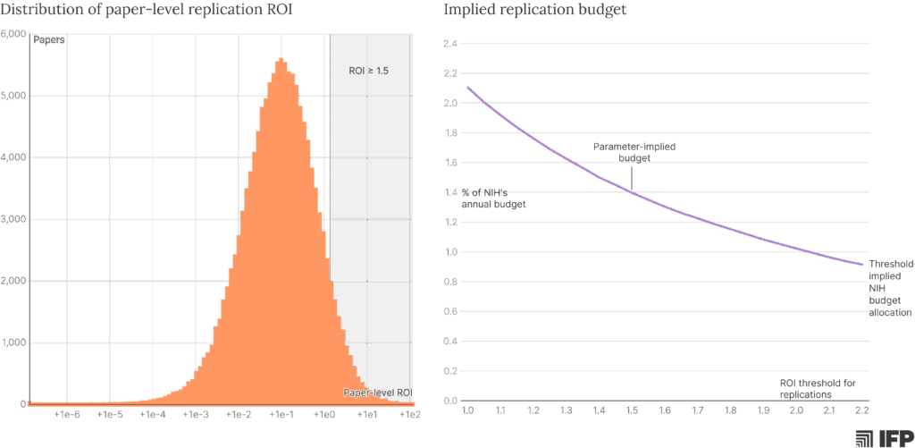 We can answer these questions by quantifying a replication study’s return on investment (ROI) and identifying when it can outperform funding for new research. Our analysis suggests that, when targeted at recent, influential studies, replication can provide large returns, sometimes paying for itself many times over. Under plausible assumptions, a well-calibrated program could productively spend about 1.4% of the NIH’s annual budget before hitting negative returns relative to funding new science. But implementation matters: a poorly designed program or mistargeted grants can easily waste resources that might have otherwise generated new biomedical innovation or sped up the discovery of life-saving cures.