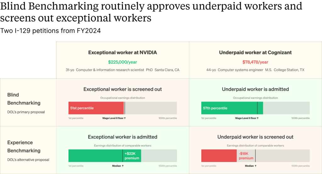 In Section III, we explore more about how Blind Benchmarking (under both the status quo and as revised in the 2026 NPRM) fails to prevent wage arbitrage and fails to block employers from sponsoring foreign workers while paying less than comparable natives. But first, we describe Experience Benchmarking, a novel alternative that DOL is also considering in this NPRM, designed to address the shortcomings of Blind Benchmarking.