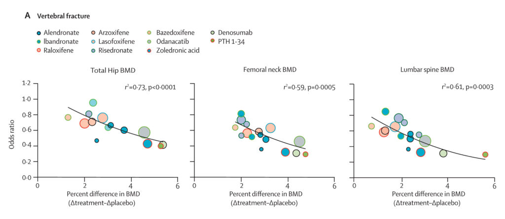 Figure 1. Association between treatment-induced changes in bone mineral density and incidence of vertebral fractures. Source.